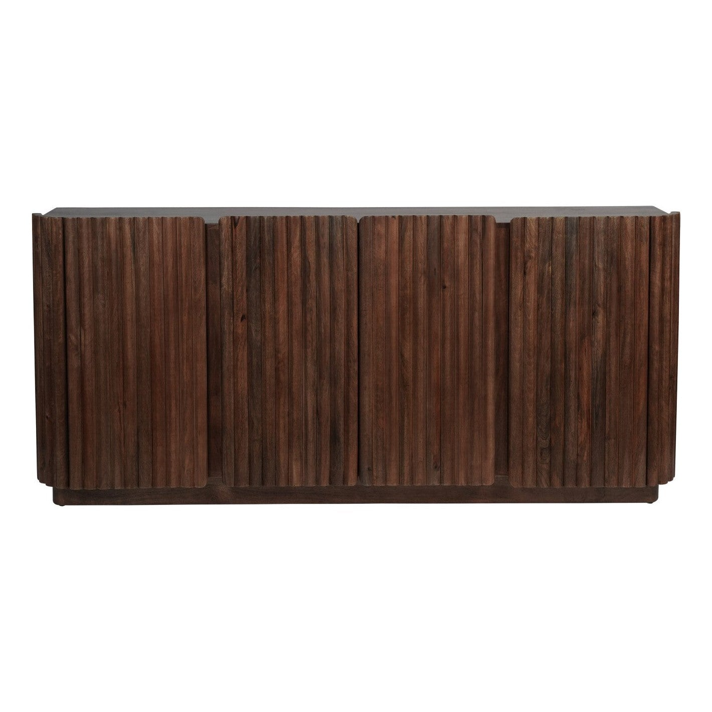 Make a bold design statement with the Cali Four Door Sideboard; a handcrafted piece that elevates any interior. Built from solid mango wood with a luxurious dark stain, this floating beauty features exquisitely carved ridged detailing and graceful curves that flow around its wraparound design. The doors create a seamless, contemporary look, while the generous storage space and fixed shelf keep everything organised in style. Standing on a refined wooden plinth, it's the perfect fusion of artisanal quality and modern sophistication that'll have your guests asking where you found it!
