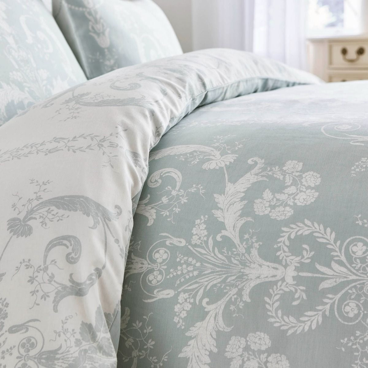 Transform your bedroom into an opulent space with the Josette Duck Egg Bed Linen. This luxurious 100% cotton bed-set is inspired by 18th century French design, featuring delicate floral patterns. Surround yourself in elegance with this reversible linen in a sophisticated duck egg blue hue.