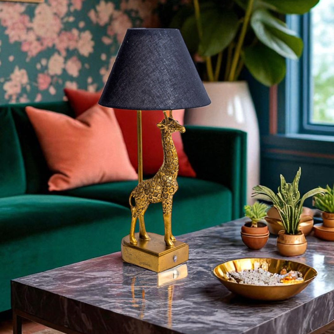 Introducing the Gold Giraffe Table Lamp, a charming addition to any space. Enjoy three different light settings, powered by either 3x AA batteries or the included 2m USB cable. The quirky giraffe design and elegant black lamp shade add a touch of whimsy to your decor.
