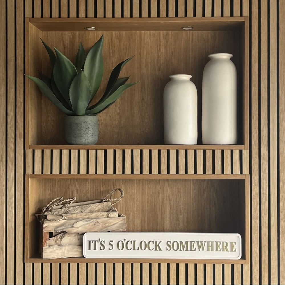 Elevate your home decor with our 'It's 5 O'Clock Somewhere' Cream and Gold Sign. This wooden sign features 3D gold foil lettering on a luxurious cream background. Perfect for adding a touch of playfulness to any space.