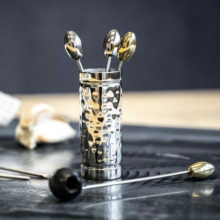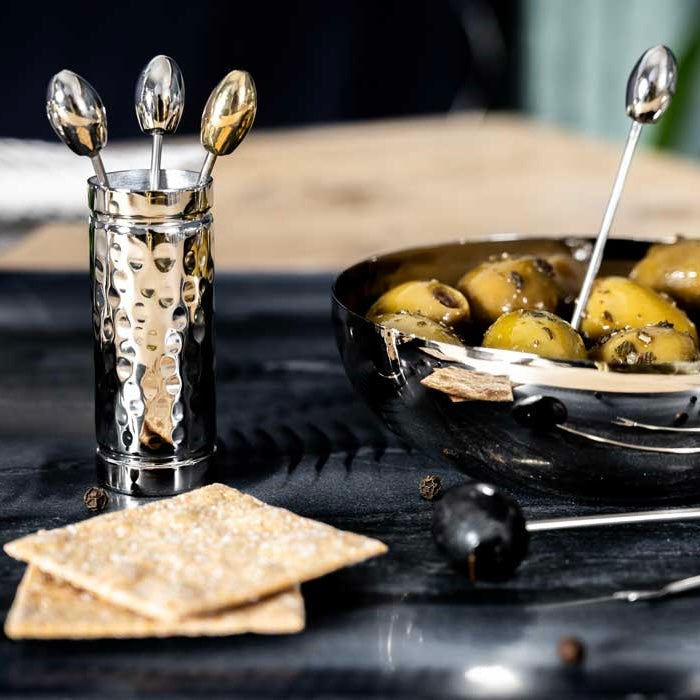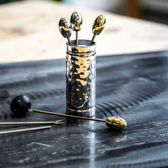 Add a touch of whimsy and elegance to your cocktails with our Gold and Silver Olive Cocktail Skewer Set. Each pick features an olive-shaped handle in gold and nickel finishes. Dual ends make it easy to spear treats or use the fork for added versatility. Comes with a stylish storage pot. Enjoy your hosting evenings in style.